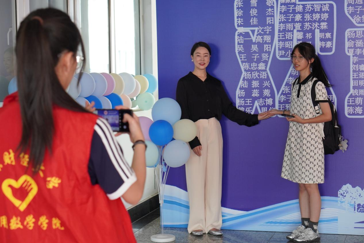 “同学,一路辛苦啦!欢迎加入数院大家庭!”“请家长放心,孩子交给我们!”……德业楼前,志愿者们手持指引牌,以热情周到的服务迎接每一位新生。楼梯口处,“数”造精彩 启“新”筑梦主题展板与缤纷气球相映成趣,由178位新生姓名组成的“欢迎新同学”字样格外醒目,成为现场最具温度的打卡点。新生们从盲盒箱中抽取写满祝福的纸条,同时收到足球比赛直播