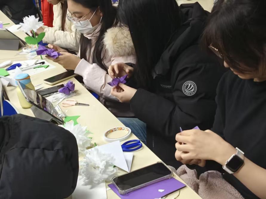 12月9日晚上,校内手工制作活动于仙林校区德业楼118教室开展。主持人介绍了活动主旨与流程后,通过播放纪录片的形式生动再现了雨花台英烈的英勇事迹。随后,主持人演示手工菊花的制作流程与核心要点。同学们分组协作,怀着对英烈的崇敬之心专注创作,将追思之情倾注于每一步操作,在庄重的氛围中完成作品,为实地敬献做好准备。
